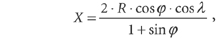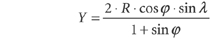 c) Stereographische Projektion. Das Projektionszentrum liegt im Gegenpunkt des Tangentialpunktes 0'. Damit gilt h=R, und die Abbildungsgleichungen ergeben sich zu ![]()
