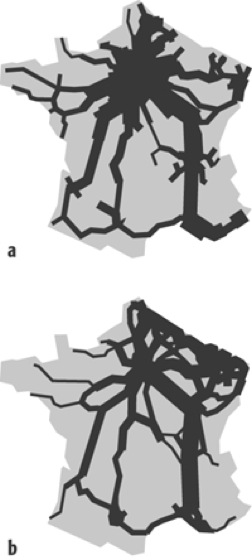 Bandkartogramm:Bandkartogramm: Eisenbahnverkehr in Frankreich: a) Personen-, b) Güterbeförderung.