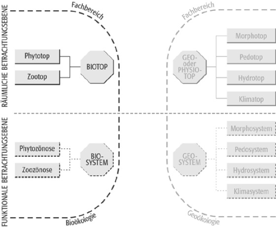 Bioökologie, E bioecology, Nachbarwissenschaft der Geoökologie; sie beschäftigt sich mit dem System Leben-Umwelt aus biologischer Sicht und steht damit der Biogeographie nahe. Forschungsgegenstand ist das Bioökosystem, das ist die Funktionseinheit pflanzlicher und tierischer Lebensgemeinschaften; sie wird wesentlich vom abiotischen Faktorengefüge bestimmt. Bioökologie bearbeitet, modellhaft betrachtet, die Teilsysteme Pflanzengemeinschaft (Phytozönose) und Tiergemeinschaft (Zoozönose). In der topischen Größenordnung werden kleine vegetationsräumliche Areale mit homogener Phytozönose als Phytotop bzw. kleine zoologische Raumeinheiten mit homogener Zoozönose als Zootop bezeichnet und kartographisch dargestellt. Phytotop und Zootop werden zur Raumeinheit Biotop i. e. S. zusammengefasst. Häufig wird Biotop allerdings allgemeiner als einheitlicher Lebensraum von pflanzlichen und tierischen Organismen verstanden, der gegenüber seiner Umgebung mehr oder weniger scharf abgrenzbar ist (vgl. geoökologische Raumeinheiten).