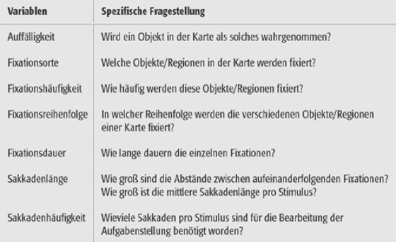 Zur Registrierung von Blickbewegungen stehen verschiedene Methoden zur Verfügung. In der kartographischen Blickbewegungsforschung kommt die Cornea-Reflex-Methode am häufigsten zum Einsatz. Sie basiert auf der Registrierung von (Infrarot-) Lichtreflexen auf der Hornhautoberfläche (Cornea). Über Teleobjektive werden das infrarot angestrahlte Auge mit einer monochromatischen Videokamera aufgenommen und aus dem Videobild Corneareflex und Pupillenkoordinaten extrahiert und nach entsprechender Entzerrung der relative Abstand von Reflex und Pupille als Blickwinkel ausgegeben. Aus der Registrierung über eine Zeitachse können sowohl Zeiten für Sakkaden (vgl. Augenbewegungen) als auch Fixationsdauern berechnet werden. Die Fixation ist die Basis aller Variablen zur Analyse des Blickverhaltens. Sie ist durch ihre Platzierung (x und y-Koordinatenwert) und Dauer gekennzeichnet (Tab.). Die Messgenauigkeit berührungslos arbeitender Systeme liegt unter 0,5 Winkelgrad, die zeitliche Auflösung variiert zwischen 50 und 60 Hz. Systeme, die an einem Kopfgestell befestigt sind, erlauben deutlich höhere Abtastraten bis zu 600 Hz bei 0,25 Winkelgrad Messgenauigkeit (Abb.).