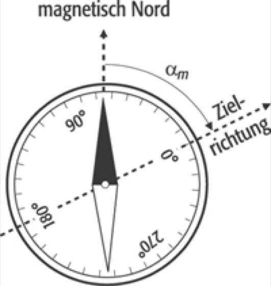 Bussole:Bussole: Ablesung des Azimutes mit dem Nordende der Magnetnadel.