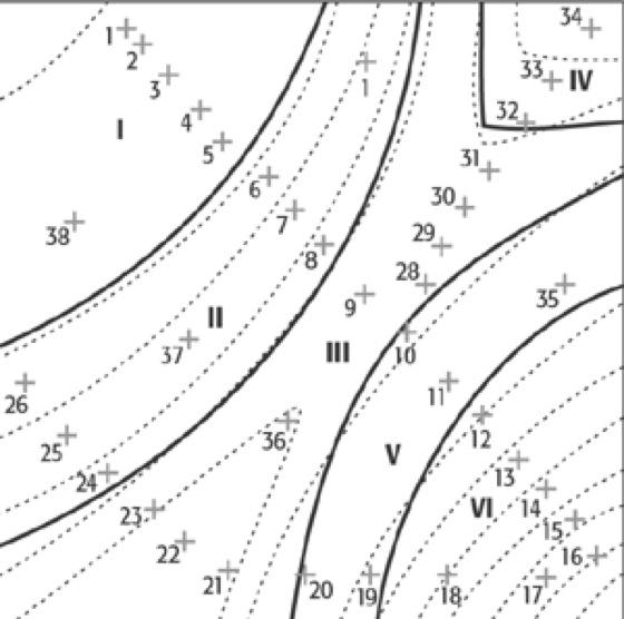 Catenakartierung:Catenakartierung: Beispiel für eine bodenkundliche Catenakartierung. Die arabischen Ziffern bezeichnen Messstellen, die römischen Ziffern unterschiedliche Bodenareale.
