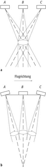 CCD-Kamera 2:CCD-Kamera 2: Drei-Zeilen-Kamera; a) drei Zeilen in einer Bildebene; b) drei Zeilen in drei Bildebenen.