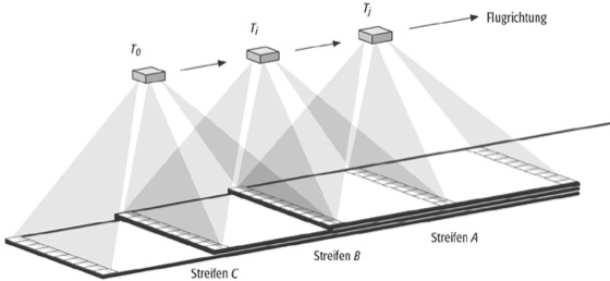 Durch die Verwendung einer CCD-Zeile in der Bildebene einer Kamera kann in Richtung der Zeile ein größeres Bildformat (etwa 120 mm) erreicht werden. CCD-Zeilen-Kameras werden einer Kamera kann in Richtung der als optoelektronische Scanner bezeichnet. Die Erfassung eines flächenhaften Objekts setzt die Aufnahme von einer bewegten Plattform voraus. Durch die Vorwärtsbewegung der Plattform rechtwinklig zur Richtung der Zeile wird nach dem Push-Broom-Prinzip ein kontinuierlicher Bildstreifen des aufgenommenen Geländes gewonnen. Alle Zeilen dieses Streifens besitzen die gleiche innere Orientierung, jede Zeile aber eine andere äußere Orientierung. Die gewonnenen Bilder sind nur zweidimensional auswertbar. Eine Drei-Zeilen-Kamera enthält drei CCD-Zeilen rechtwinklig zur Bewegungsrichtung der Plattform. Alle drei CCD-Zeilen können in der Bildebene einer Kamera aber auch je eine Zeile in den Bildebenen von drei starr miteinander verbundenen Kameras bei konvergenten Aufnahmeachsen angeordnet sein. Damit werden drei Bildstreifen im Rück- und Vorblick sowie in Nadirrichtung gewonnen. Die unterschiedliche äußere Orientierung der Zeilen, die den gleichen Objektbereich erfassen, ermöglicht eine dreidimensionale photogrammetrische Bildauswertung. Für die Aufnahme stationärer Objekte von einer ortsfesten Plattform sind CCD-Kameras sowohl mit Flächen- als auch Zeilen-Sensoren geeignet. Durch die systematische sequentielle Verschiebung des CCD-Arrays oder der CCD-Zeile über die Bildebene einer Kamera bei geöffnetem Verschluss können Bildformate realisiert werden, die denen photogrammetrischer Messkameras entsprechen. Die Verwendung raster- oder zeilenförmig angeordneter Farbfilter vor den einzelnen Sensorelementen eines CCD-Arrays oder einer CCD-Zeile bildet die Grundlage für die Aufnahme digitaler Farbbilder oder Multispektralbilder (Abb. 1 und Abb. 2).