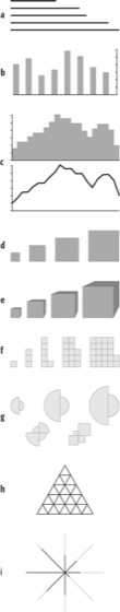 Diagrammfigur, E diagram figure, kleine graphische Gestalt zur Anwendung in kartographischen Darstellungen und graphischen Übersichten. Sie können sich als Diakartogramme auf eine Fläche und als Signaturen auf einen Punkt beziehen. Diagrammfiguren gestatten in kartographischen Darstellungen über die Darstellung von Objektarten mittels Signaturen und der Größenkennzeichnung mittels Mengensignaturen hinaus die Berücksichtigung von ein bis zwei weiteren Merkmalen: eine Sachgliederung, die Einbeziehung der Entwicklung und damit verbunden oder getrennt die Zerlegung einer Gesamtheit in Anteile. Die dafür benutzten Wertmaßstäbe können sich auf Strecken beziehen, auf Flächen oder auf Körper. Nur ausnahmsweise sollten aus Gründen der erschwerten optischen Auffassbarkeit logarithmische oder andere progressive Wertmaßstäbe zur Anwendung kommen. Zu unterscheiden sind (Abb.): a) Stäbchendiagramm für Strecken, Längen und eindimensionale Wertreihen, b) Säulendiagramm für ein- bis zweidimensionale Wertreihen und Flächen, c) Kurvendiagramm (Treppenkurve, gebrochene Kurve, echte Kurve) für Zeitpunktfolge-Darstellungen, d) Flächendiagramm, hauptsächlich Quadrat, Rechteck und Kreis, seltener Dreieck und Kreisring, für flächenhafte Sachverhalte und solche Mengen, die hinsichtlich ihrer Anordnung auf einer Fläche zweidimensional aufgefasst werden können (Bevölkerung, Haustiere), e) Körperdiagramm, insbesondere Würfel, Quader, seltener Kugel, Zylinder oder Pyramide, für Volumendarstellungen (Wasserinhalt, Vorräte von Lagerstätten), f) Felderdiagramm, das aus quadratischen, rechteckigen oder anderen geometrischen Figuren zusammengesetzt ist, g) gekoppeltes Flächendiagramm aus zwei Halbkreisen, vier Kreissektoren, vier Quadranten oder zwei bis fünf Säulen zur Gegenüberstellung von zwei bis fünf Zuständen, h) Korrelationsdiagramm als Zweifachkorrelation (zweiachsig) und Dreifachkorrelation (dreiachsig oder als Dreieckskoordinatennetz, Dreiecksdiagramm) zur Korrelation zwischen zwei oder drei Sachverhalten, von Sachverhalt und Zeit oder von zwei Zeitreihen (Tages- und Jahresgang, Isoplethen), i) sternförmiges Diagramm als Richtungsdiagramm bezogen auf Himmelsrichtungen (z. B. Anteile der Hauptwindrichtungen), als Zeitdiagramm (Vollkreis als Tag oder Jahr) oder mit Sachuntergliederung unabhängig von Richtung und Zeit, k) kombiniertes Diagramm, z. B. Klimadiagramm. Alle diese Formen gestatten Untergliederungen, mit denen Anteile der Gesamtmenge und z. T. auch die zeitliche Entwicklung graphisch sichtbar gemacht werden können. Die Wahl der für einen Sachverhalt jeweils optimalen Form und die Art ihrer inneren Differenzierung verlangen eine Analyse des darzustellenden Gegenstands und seiner Eigenschaften, sind aber auch von der Zweckbestimmung abhängig.
