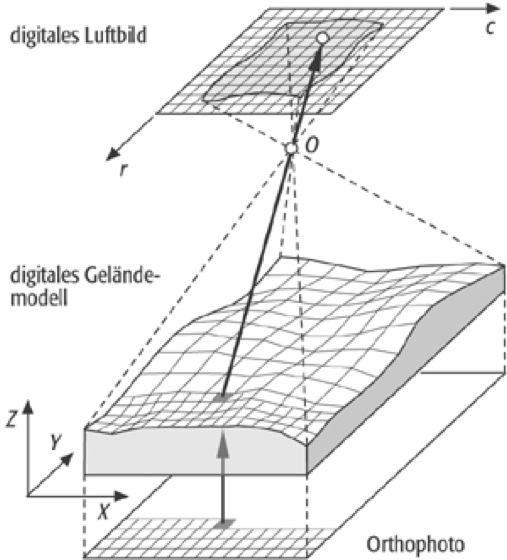 Die indirekte digitale Entzerrung geht von der Festlegung der Geometrie (Größe, Positionierung und Pixelgröße) des zu erzeugenden digitalen Orthophotos aus. Für jedes Pixel des Orthophotos sind damit die Lagekoordinaten (X,Y) im Objektraum und die durch Interpolation im digitalen Höhenmodell gewonnenen Höhen (Z) bekannt. Auf Grundlage der Kollinearitätsbedingung lässt sich unter Beachtung der Daten der inneren Orientierung und äußeren Orientierung die Lage des zugeordneten Punkts im digitalen Luftbild ermitteln. Mittels Resampling zwischen benachbarten Pixeln des digitalen Luftbildes wird der gesuchte Intensitätswert für das Pixel des Orthophotos durch Interpolation gewonnen und sequentiell abgespeichert (Abb.).