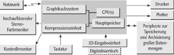 digitales Auswertegerät, digitale photogrammetrische Arbeitsstation, E digital photogrammetric plotter, EDV-Arbeitsplatz zur photogrammetrischen Einbildauswertung, Zweibildauswertung und Mehrbildauswertung digitaler Bilder. Als Hardware kommen Rechner mit leistungsfähiger CPU, großem Hauptspeicher, schnellen Bussystemen und Graphiksubsystemen mit großem Bildspeicher zum Einsatz. Dazu gehören außerdem modulare Hardwareeinheiten zur schnellen Bilddatenkompression, zur optionalen Stereobetrachtung, zur dreidimensionalen Eingabe von Daten (z. B. 3D-Maus) sowie ein graphischer Kontrollmonitor. Als periphere Geräte zur Speicherung und Archivierung großer Datenmengen dienen Magnetplatten, magneto-optische Platten, Jukeboxes u.a. (Abb.).