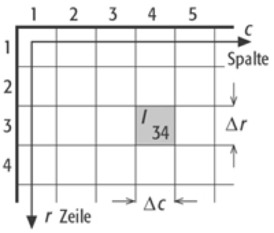 digitales Bild, E digital image, geordnetes Schema diskreter Intensitätswerte (Dichte, Grauwerte, Farbwerte), die die zweidimensionale kontinuierliche Intensitätsfunktion eines analogen Bildes approximieren. Die Bildelemente des digitalen Bildes sind die in der Regel rechteckigen Pixel (picture elements). Die Geometrie des Bildes ist durch die Anordnung der Pixel in senkrechten Spalten c (column) und waagrechten Reihen r (row) die Radiometrie durch den sequentiell abgespeicherten diskreten Intensitätswert I (Mittelwert) für die Fläche des jeweiligen Pixels gegeben (Abb.). In Abhängigkeit von der radiometrischen Auflösung unterscheidet man Binärbilder, Intensitätsbilder und mehrbandige digitale Bilder (I Vektor für mehrere Kanäle). In der Photogrammetrie und Fernerkundung haben digitale Bilder zunehmende Bedeutung für die Anwendung numerischer Prozesse der digitalen Bildverarbeitung, Bildanalyse und photogrammetrischen Bildauswertung. Sie bilden die Grundlage für die zunehmende Automatisierung der Auswerteprozesse. Digitale Bilder können direkt, z. B. mit einer Digitalkamera, aufgenommen oder durch Digitalisierung mit einem Scanner aus analogen (photographischen) Bildern generiert werden.