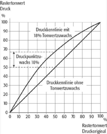 Druckkennlinie, E charateristic linie of printing, graphische Darstellung der Tonwertübertragung vom Druckoriginal auf den Bedruckstoff(Abb.). Bei der Übertragung von Drucksachen, auch Karten, von einem Träger auf einen anderen z. B. vom Druckoriginal zur Druckform, von der Druckform zum Bedruckstoff treten Tonwertverfälschungen auf, die im gedruckten Produkt zu Farbverfälschungen führen. Die Druckkennlinie ermöglicht eine Aussage zu den Veränderungen der Tonwerte beim Druckprozess. Aus ihr lässt sich unter anderem der Druckpunktzuwachs ablesen.
