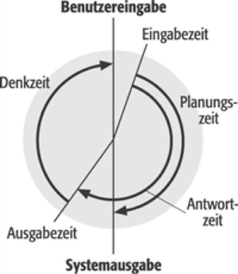 Insgesamt können aus Sicht der Nutzer verschiedene Zeitabschnitte einer Interaktion unterschieden werden: 1. die Eingabezeit entspricht dem Zeitraum einer Benutzereingabe, die durch eine Systemausgabe beantwortet wird, z. B. einem Tastendruck, 2. die Ausgabezeit entspricht dem Zeitraum einer Systemausgabe, z. B. eines Rendering-Prozesses zur Aktualisierung des Bildschirminhalts, 3. die Antwortzeit entspricht dem Zeitraum zw. Benutzereingabe und Systemausgabe, die für den Benutzer letztendlich das Gefühl der Echtzeit vermittelt, 4. die Denkzeit entspricht dem Zeitraum zw. Systemausgabe und einer nächsten Benutzereingabe, die prinzipiell zeitunkritisch ist und 5. die Planungszeit entspricht dem Zeitraum zw. Eingabe und Ausgabe, in dem ein Benutzer das weitere Vorgehen plant. Dieser Zeitraum steht dem Softwaresystem prinzipiell für weitere Berechnungen während der Antwortzeit zur Verfügung.