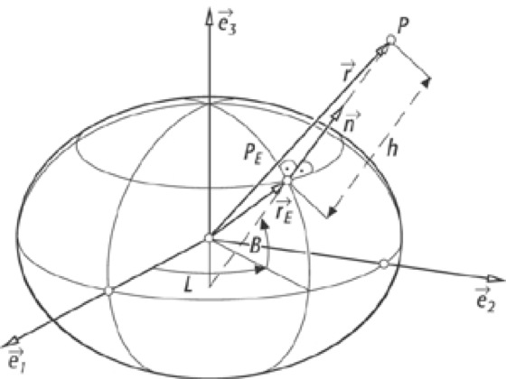 ellipsoidische Höhe, E ellipsoidic height, h, fast ausschließlich verwendete geometrische Höhe, die den Abstand eines Raumpunktes längs eines geradlinigen Lotes von einem geeignet gewählten Rotationsellipsoid angibt. Ellipsoidische Höhen können im Prinzip mit Hilfe der trigonometrischen Höhenbestimmung (unter Berücksichtigung der Lotabweichungen), bzw. des trigonometrischen Nivellements oder alternativ mit Hilfe des geometrisch-astronomischen Nivellements bestimmt werden. Diese Verfahren sind nur mäßig genau und sehr aufwendig. Neuerdings können ellipsoidische Höhen mit Hilfe präziser Navigationsverfahren (z. B. Global Positioning System) verhältnismäßig schnell gemessen und bei Kenntnis des Geoids bzw. des Quasigeoids in physikalische Höhen, wie z. B. in orthometrische Höhen bzw. Normalhöhen umgerechnet werden. Diese Vorgehensweise wird zunehmend zur Bestimmung von physikalisch definierten metrischen Höhen angewendet, auch wenn die Genauigkeit noch hinter der des geodätischen Nivellements zurückbleibt. Der Ortsvektor r eines beliebigen Raumpunktes P kann als Summe des Ortsvektors [r pfeil]E zum Ellipsoid-Projektionspunkt PE und dem Normalenvektor [n pfeil] in diesem Punkt, multipliziert mit der ellipsoidischen Höhe h, dargestellt werden (Abb. 1):