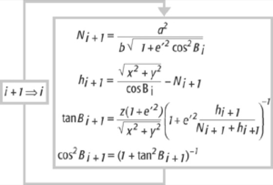 während die Breite B iterativ berechnet werden muss. Man beginnt die Iteration mit der Breite unter Vernachlässigung der ellipsoidischen Höhe