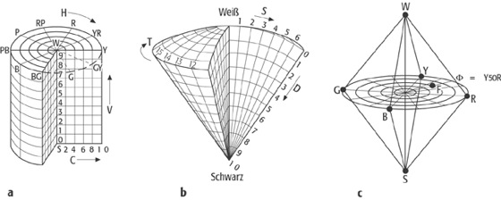 Empfindungsgemäße Farbordnungen:Empfindungsgemäße Farbordnungen: Darstellung der Farbkörper folgender Sxsteme: a) Munsell-Farbsystem, b) DIN-Farbenkarte, c) NCS-Farbsystem.