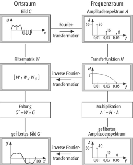 Durch eine inverse Fouriertransformation kann sowohl die Transferfunktion H in die Filtermatrix W als auch das Amplitudenspektrum A′ des Ausgabebildes in die Matrix des Ausgabebildes G ′ überführt werden.