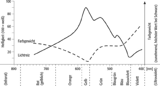 Farbhelligkeit:Farbhelligkeit: Helligkeit (Lichtreiz) und Farbgewicht der reinen Farben (nach Arnberger).