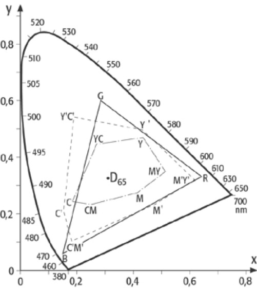 Farbumfang:Farbumfang: Normfarbtafel mit Darstellung der Farbumfänge von Farbbildschirm RGB, Offsetdruck auf Kunstdruckpapier C'M'Y', Offsetdruck auf Landkartenpapier CMY.