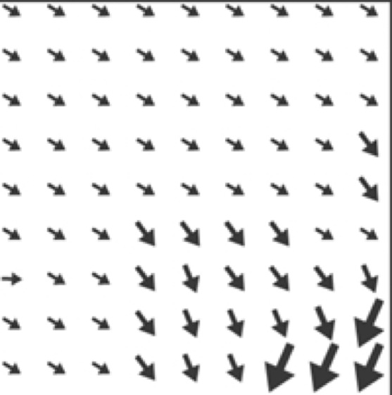 Flächenrichtungskarte, E area orientation map, abgeleitet aus der kartographischen Objekt-Zeichen-Referenzierung ein Kartentyp zur Repräsentation von nominal- oder ordinalskalierten Daten mit Bezug zu künstlich definierten Netzzellen eines regelmäßigen Rasternetzes (Abb.). Die Repräsentation der Daten in der Flächenrichtungskarte erfolgt auf der Grundlage des kartographischen Zeichenmodells durch punktförmige Pfeilzeichen, die mit Hilfe der graphischen Variablen Richtung und Größe variiert werden können. Flächenrichtungskarten bilden für jede Netzzelle neben einem beliebigen Messwert einen Richtungsvektor ab, wie beispielsweise für Abflussrichtungen von Niederschlagsmengen oder für Windrichtungen (Felderprinzip, Vektormethode).