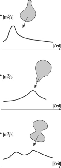 Formindex:Formindex: Der Einfluss der Einzugsgebietsform auf die Form der Abflussganglinie und die Geschwindigkeit des Durchlaufs einer Hochwasserwelle (verändert nach Saxton & Shiau 1990).