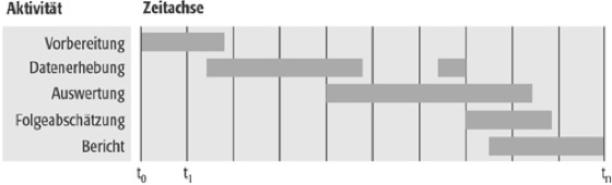 Gantt-Diagramm, E Gantt chart, Diagramm zur Abbildung der Zeitplanung im Projektmanagement, das den Ablauf von Aktivitäten auf einer Zeitachse verdeutlicht (Abb.).
