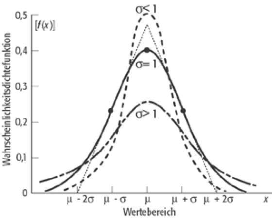 Gauß-Kurve, E Gaussian curve, Gauß'sche Normalverteilung, Normalverteilung, nach C.F. Gauß (1777-1855) benannte, aber schon von A. de Moivre (1667-1754) definierte Häufigkeitsverteilung bzw. Wahrscheinlichkeitsdichtefunktion, welche die Form einer symmetrischen Glockenkurve besitzt (Abb.) und der Funktion:
