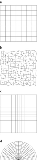 Gitter:Gitter: Verschiedene Gittertypen a) regelmäßiges Gitter, b) unregelmäßiges Gitter, c) blockstrukturiertes Gitter und d) kurvilineares Gitter.