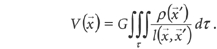 Dabei ist τ das geschlossene, beschränkte Raumgebiet (das Volumen des betrachteten Körpers), P([x pfeil] ) der Aufpunkt (der bei der Berechnung feste Punkt), Q([x pfeil] ′ ) der Quellpunkt (der unter der Integration laufende Punkt), ρ([x pfeil] ′ ) die auf τ beschränkte Dichteverteilung, l([x pfeil], [x pfeil] ′ )=|[x pfeil] - [x pfeil] ′ | der Abstand zwischen Auf- und Quellpunkt, und ρ([x pfeil] ′ )dτ=dm das differentielle Massenelement (die Massenbelegung). Die Funktion 1/1([x pfeil], [x pfeil] ′ ) wird als Newton'scher Kern bezeichnet und spielt eine herausragende Rolle in der Potentialtheorie. Das Gravitationspotential ist im Außenraum einschließlich seiner ersten und zweiten partiellen Ableitungen endlich und stetig. V ist regulär im Unendlichen: