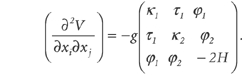 Dabei sind κ1 bzw. κ2 die Krümmung der Äquipotentialfläche V(P)=const in Nord-Süd- bzw. West-Ost-Richtung, τ1 die Torsion des Meridians sowie φ1 bzw. φ2 die Krümmung der durch P verlaufenden Lotlinie in Nord-Süd- bzw. West-Ost-Richtung. Die mittlere Krümmung wird durch H und die Gauß'sche Krümmung durch K= κ1·κ2 beschrieben.
