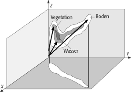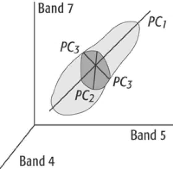 Bei Fernerkundungsdaten liegen i. a. hohe Korrelationen vor, besonders innerhalb der Spektralbänder im sichtbaren Bereich, im nahen und im mittleren Infrarot. Diese hohe Korrelation erklärt sich aus den Spektraleigenschaften der Oberflächen. Somit ist zum einen die Varianz eines Spektralbandes ein Maß für seinen Informationsgehalt (sie ist ein Maß für die Streuung der Daten in diesem Band). Zum anderen ist die Kovarianz zwischen zwei Kanälen ein Maß für die Korrelation zwischen den Datensätzen und damit für den Informationsgewinn bei einer Kombination beider Spektralbänder. Hier setzt die Hauptkomponententransformation an. Über die Berechnung der Varianz-Kovarianz-Matrix eines Datensatzes wird das gesamte Koordinatensystem so gedreht, dass die neuen Koordinatenachsen jeweils in die Richtung der maximalen Streuung (= Varianz) des Datenclusters zeigen. Dies geschieht über die Berechnung der Eigenwerte und Eigenvektoren der gegebenen Varianz-Kovarianz-Matrix. Die Grundvoraussetzung für die neuen Kanäle, die Hauptkomponenten, ist, dass sie untereinander nicht korreliert sind, d. h. ihre Kovarianz ist gleich Null. Die erste Hauptkomponente zeigt demnach in die Richtung der größten Ausdehnung des Datenclusters (= Hauptachse eines Rotationsellipsoids); die zweite Hauptkomponente in die Richtung der zweitgrößten Ausdehnung des Datenclusters und zwar orthogonal zur Richtung der ersten Hauptkomponente. Die erste Hauptkomponente enthält somit ein Maximum an Informationen (sie beinhaltet die größtmögliche Varianz des gesamten Datenclusters). Die zweite Hauptkomponente bietet den statistisch größtmöglichen Informationszuwachs (Abb. 2 und Abb. 3).