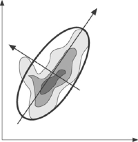Hauptkomponententransformation 2:Hauptkomponententransformation 2: Datencluster im zweidimensionalen Raum. Eingezeichnet ist eine Ellipse, die ca. 95% der Daten umfasst. Ihre Hauptachsen entsprechen den Hauptkomponenten.