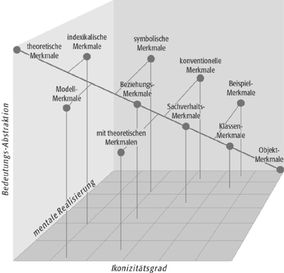 Das Anlegen von Ikonizität in konkreten Zeichen wird von drei Abbildungsaspekten bestimmt (Abb.): 1. Vom Abstraktionsgrad der repräsentierten Zeichenbedeutung, d. h. von dem materiellen bis theoretischen Charakter abgebildeter Objekte, Sachverhalte und Sachverhaltsmerkmale, wobei mit zunehmender Abstraktheit die ikonischen Abbildungsmöglichkeiten abnehmen. 2. Von der mentalen Realisierung der Zeichen durch Assoziationen und Analogiebildungen. So nimmt die Möglichkeit der mentalen Realisierung der repräsentierten Zeichenbedeutung zu, wenn Aspekte der abgebildeten Zeichenbedeutung entweder mental verfügbar und/oder aus dem Zeichen durch Assoziationen ableitbar sind. 3. Der Grad der Ikonizität selbst, der bei Zunahme eine erhöhte Übereinstimmung zwischen Bedeutung und Zeichen charakterisiert.