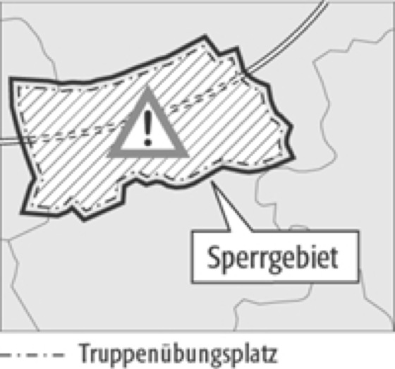 IndexikalitätIndexikalität: Zeichen für "Truppenübungsplatz" mit hinweisenden indexikalischen Zeichen für "unpassierbar", "nicht betretbar", "gefährlich" etc. (zusätzliche Flächenbegrenzungslinie, verstärkter Figur-Hintergrund-Kontrast, Linienschraffur, "Achtung"-Zeichen, Pfeil-Zeichen, warnender Text).