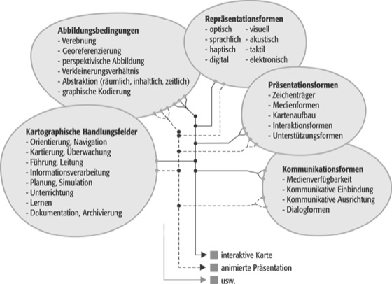 Obwohl sich ein Teil der Kartenbezeichnungen in der Praxis etabliert und in der Vergangenheit bewährt hat, ist es erforderlich, die genannten Ansätze der Klassifikation vor allem aufgrund der zukünftigen Anwendung von Karten und kartographischen Medien im Rahmen von elektronischen Systemen zu erweitern und für weitere Entwicklungen offen zu halten. Karten werden taxonomisch eindeutig klassifiziert, indem ein System von Merkmalgruppen definiert wird, mit dessen Hilfe gültige und relevante Kartenstrukturen sowie Kartenherstellungs- und Kartennutzungsformen ohne Merkmalüberschneidungen erfasst werden. Ziel einer solchen Kartentaxonomie (Taxonomie) ist u. a. das Ableiten von Nutzungs- und Kommunikationsbedingungen aus vorhandenen kartographischen Medien und umgekehrt das Ableiten von Karten aus vorgegebenen Nutzungs- und Kommunikationsbedingungen. Die wichtigsten, von der Anzahl und vom Umfang erweiterbaren Merkmalgruppen einer Kartentaxonomie (Abb.) sind 1. kartographische Abbildungsbedingungen, die die verschiedenen Strukturen und Wirkungen von Karten bzw. kartographischen Medien bestimmen, 2. Formen der kartographischen Repräsentation, die zu unterschiedlichen Möglichkeiten der Informations- und Wissensgewinnung mit Karten führen, 3. Formen der kartographischen Präsentation, durch die unterschiedliche mediale Darbietungen, Aktionen und Nutzungsausrichtungen vorgegeben werden, 4. Formen der Kommunikation (kartographische Kommunikation), die die Voraussetzungen und Bedingungen der Informationsübermittlung festlegen sowie 5. kartographische Handlungsfelder, mit deren Hilfe die Ausrichtungen und Unterstützungsfunktionen von kartographischen Medien im Rahmen von raumbezogenen Handlungsprozessen unterschieden werden. Auf der Basis der Zuordnung dieser Merkmale bzw. deren Ausprägungen zu kartographischen Medien werden diese umfassend charakterisiert. Wenn erforderlich, wie z. B. bei häufigem Auftreten in der Praxis, kann die Karte oder das Medium zusätzlich durch einen Namen ("interaktive Karte") oder eine Bezeichnung ("animierte Präsentation") schnell und einprägsam unterschieden werden.