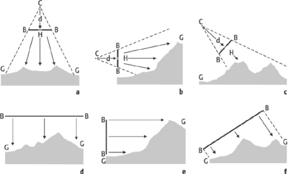 kartenverwandte Darstellung:kartenverwandte Darstellung: Geländeabbildungen mit unterschiedlicher Blickrichtung und Perspektive. a) Zentralperspektive auf horizontale Bildebene und mit lotrechter Blikkachse, b) Zentralperspektive auf lotrechte Bildebene und mit darauf senkrechter Blikkachse, c) Zentralperspektive auf schräge Bildebene und darauf senkrechter Blickachse, d) Parallelperspektive auf horizontale Bildebene und mit lotrechten Projektionsstrahlen (Grundriss), e) Parallelperspektive auf lotrechte Bildebene und darauf senkrechten Projektionsstrahlen. B-B Bildebene, C Augenpunkt (Projektionszentrum), G-G Geländeoberfläche, H Hauptpunkt.