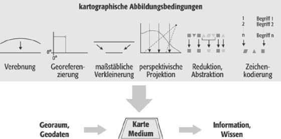 kartographische Abbildung, E cartographic depiction, Wirkungszusammenhang graphisch-optischer Bedingungen und Eigenschaften in Karten, die bei der kartographischen Reproduktion von georäumlichen Merkmalen (Geodaten) zum Tragen kommen. Die visuelle Ableitung kartographischer Informationen und die mentale Repräsentation von kartographischem Wissen werden dabei durch die Struktur und Wirkung kartographischer Abbildungen wesentlich mitbestimmt. Impliziert wird beim Begriff kartographische Abbildung der Prozess der Abbildung, als Vorgang der Anwendung kartographischer Abbildungsbedingungen sowie das Ergebnis der Abbildung, in seiner optischen Wirkung aufgrund kartographischer Abbildungseigenschaften im Rahmen der kartographischen Informationsverarbeitung. Die Bedingungen kartographischer Abbildung führen zu spezifischen informationellen und wissensbezogenen Eigenschaften von Karten und unterscheiden diese dadurch von kartenähnlichen und anderen Medien. Aus der Variation und Kombination von kartographischen Abbildungsbedingungen ergeben sich spezifische Formen der Repräsentation, wie etwa bei 3D-Darstellungen oder sog. animierten Darstellungen (kartographische Animation), die zu anderen Möglichkeiten der Wissensaufnahme und -verarbeitung führen als bei Karten. Die Repräsentation realer oder gedanklich existierender georäumlicher Zustände und Relationen ist in Karten aufgrund der Wirkung kartographischer Abbildungen nur eingeschränkt möglich. Trotz dieser Einschränkungen ergeben sich in Karten aus der gemeinsamen Wirkung von kartographischen Abbildungsbedingungen positive und unverwechselbare Unterstützungsformen für die Aufnahme und Verarbeitung von georäumlichem (kartographischem) Wissen. Obwohl einerseits lineare Verkürzungen bei geneigten Flächen in der Abbildungsebene, maßstäblich bedingte Abstraktionen oder zeichenbedingte Vereinfachungen existieren, kann andererseits beispielsweise ein räumlicher Überblick gewonnen werden, bei dem gleichzeitig räumlich-inhaltliche Abgrenzungen, Vergleiche und Bewertungen durchgeführt werden, wie es in der Realität oder mit anderen Medien in dieser Form nicht möglich ist. Aufgrund dieser positiven Wirkungseigenschaften kartographischer Abbildung ist davon auszugehen, dass die allgemeine georäumliche Wissensbildung wesentlich durch Karten beeinflusst wird (vgl. kognitive Karte) (Abb.).
