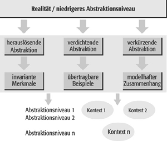 Bei gedanklichen Abstraktionsprozessen im Rahmen der kartographischen Informationsverarbeitung werden verschiedene Verallgemeinerungsaspekte unterschieden (Abb.): Bei der herauslösenden (generalisierenden) Abstraktion werden unwesentliche Eigenschaften ausgesondert und wesentliche Eigenschaften, die in Relation zu übergeordneten Merkmalsystemen stehen können, als Invarianten hervorgehoben; bei der verdichtenden (isolierenden) Abstraktion werden bestimmte Eigenschaften aus ihrem Zusammenhang herausgelöst und diese gedanklich als Repräsentanten oder Beispiele genutzt, die besonders typische Merkmale in einer konzentrierten und anschaulichen Anordnung zeigen; bei der verkürzenden (idealisierenden) Abstraktion werden mit Hilfe abstrakter Regeln Eigenschaften in eine übergeordnete und zusammenfassende Beziehung gesetzt. Wichtigster Aspekt von Abstraktions- und Generalisierungsprozessen in der Kartographie ist das Zugänglichmachen konkreter Situationen durch die verallgemeinernde begriffliche Erkenntnisbildung. Daraus folgt beispielsweise die Erkenntnisgewinnung durch Transformation von Wissen auf ein theoretisch höheres Niveau oder die Wissenstransformation in einem anderen Zusammenhang. Für die kartographische Generalisierung sind diese allgemeinen Ansätze der Erkenntnisbildung wichtige Grundlagen zur zielgerichteten Ausrichtung von repräsentiertem Wissen in Karten und Medien auf die gedanklichen Fähigkeiten und Erwartungen von Kartennutzern (kartographische Repräsentation).).
