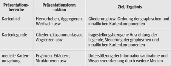 kartographische Präsentation, E cartographic presentation, mediale und kommunikative Ausrichtung von in Karten angelegten graphischen Mustern bzw. abgebildeten georäumlichen Inhalten. Ziel ist eine fragestellungsorientierte, wirkungsvolle und effektive Übermittlung kartographischer Informationen bzw. kartographischen Wissens. Als Präsentationsformen bzw. im Rahmen von Präsentationsvorgängen werden dazu im Kartenbild Zeichenmuster optisch hervorgehoben oder zurückgesetzt, Informationseinheiten gegliedert, aggregiert, hinzugefügt oder entfernt (ein- und ausgeblendet). In der Kartenlegende werden Legendeneinheiten gegliedert, zusammengefasst, zusätzlich erläutert oder in Form von Steuerungseinheiten zur Veränderung von Präsentationen im Kartenbild entsprechend geführt. Durch die Präsentation von zusätzlichen konkretisierenden oder abstrahierenden Informationseinheiten werden visuell-kognitive Prozesse der Wissensaufnahme und -verarbeitung unterstützt (Tab.). Die mit der kartographischen Präsentation verbundenen Systemaktionen oder vom Systemnutzer ausgelösten Interaktionen steuern den Wechsel von Medien und die Veränderung von Präsentationsformen. Mit Ihrer Hilfe werden die Form des Wechsels bzw. der Veränderung sowie der Zeitpunkt, die Folge und der Umfang einer Präsentation bestimmt.