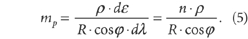 Die rechte Seite für mp ergibt sich aus der Differentiation der Gleichung (2). Wird für den Berührungsparallel in (5) ρ0 und φ0 eingesetzt, so ist aufgrund der erwähnten Längentreue: ![]()