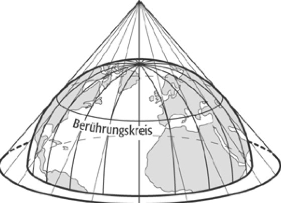 Je nach dem Öffnungswinkel des Kegels und des Abstands seiner Spitze S vom Kugelmittelpunkt werden Berührungskegel (Abb. 2), Schnittkegel (Abb. 3) und gewissermaßen über der Kugel schwebende Kegel unterschieden (Kartennetzentwürfe; Bd. 1, Abb. 2). Es ist offensichtlich, dass abzubildende Gebiete in der Nähe des Berührungskreises oder der Schnittkreise nur geringe Verzerrungen aufweisen.