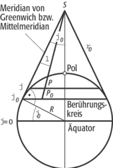 Für die Größe des Öffnungswinkels des Kegels wird ein Proportionalitätsfaktor n im Bereich 0 < n < 1 eingeführt. Die Grenzwerte n = 1 bzw. n = 0 führen auf einen Azimutalentwurf bzw. auf einen Zylinderentwurf. In Abbildung 2 ist der Schnitt eines die Kugel in der Breite φ0 tangierenden Kegels mit der Spitze S dargestellt. Ein beliebiger Kugelpunkt P hat die geographischen Koordinaten φ und λ.