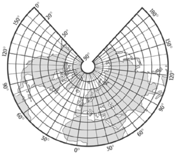 4. Flächentreuer Schnittkegelentwurf(Abb. 7), von H.C. Albers 1805 eingeführt. Die Längenverzerrungen der Bilder der Meridiane und Parallelkreise sind kleiner als beim vorher behandelten Lambert'schen Entwurf. Diesen Vorteil erreichte Albers durch Verwendung zweier längentreuer Parallelkreise (vgl. Abb. 3), also eines Schnittkegels. In Abbildung 7 sind die Parallelkreise φ1 = 35° und φ2 = 65° verwendet worden. Die Abbildungsgleichungen unterscheiden sich nicht von den in den Gleichungen (9) genannten, aber die charakterisierenden Konstanten sind wesentlich komplizierter zu berechnen:
