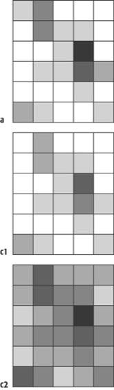 c) Klassenbildung nach mathematischen Progressionen bzw. Prinzipien. Sie kann dann sinnvoll sein, wenn eine leichte quantitative Vergleichbarkeit der Klassen gewünscht wird. Auch ist die rechentechnische Ausführung relativ problemlos. Da die mathematisch ermittelten Klassengrenzen keinen Raumbezug haben, ist das Verfahren nur von geringer Bedeutung. Die bekanntesten Progressionen sind die arithmetische (äquidistante) Reihe und die geometrische Reihe (Abb. 1 c1, c2). Seltener kommen die radizierende Reihe und die reziproke Reihe zur Anwendung. Bei der Anwendung des Prinzips der Quantilen wird erreicht, dass sämtliche Klassen in einer gleich großen Anzahl von Bezugseinheiten vorkommen, womit eine maximale graphische Differenzierung erreicht wird.
