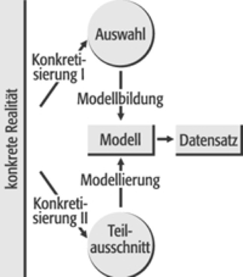 In der Kartographie sind beide Sichten von Interesse. Konkretisierung nach der ersten Sicht betrifft Vorgänge der kartographischen Modellierung, das heißt z. B. der Anwendung von Daten- und Zeichenmodellen auf konkrete Fälle der Datenerhebung oder der Kartenkonstruktion. Der Prozess, vom Konkreten zum Abstrakten zu kommen, betrifft Vorgänge der kartographischen Modellbildung. Bei der Modellbildung wird zum Beispiel ein konkreter Raumausschnitt (Region, Staat) in ein abstraktes semantisches Datenmodell überführt, wie z. B. bei der Entwicklung des Objektartenkatalogs von ATKIS-DLM. Im umgekehrten Fall werden danach entsprechend der zweiten Sicht mit Hilfe dieses abstrakten Modells konkrete Teilausschnitte des Raums verallgemeinernd beschrieben bzw. datenmäßig erfasst. Dabei werden nur diejenigen Merkmale und Objekte selektiert, die im Modell definiert sind. Streng genommen handelt es sich bei beiden dargestellten Vorgängen um Abstraktionsprozesse, die im ersten Fall zu einem abstrakten Modell und im zweiten Fall zu einem konkreten Datensatz und danach zu einer Karte führen (Abb.).