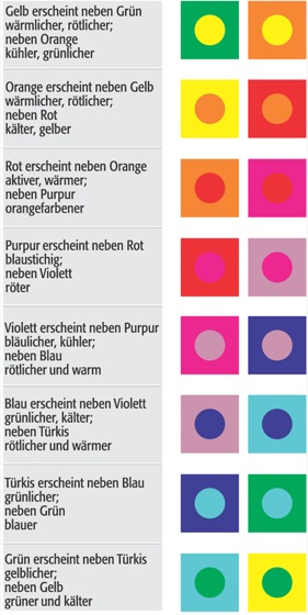 Gelb etwa wirkt neben Grün wärmer, rötlicher, neben Orange kühler und grünlicher, Orange neben Gelb wärmer, rötlicher, neben Rot kälter und gelber. Weitere Beispiele vgl. Abbildung 2 im Farbteil.