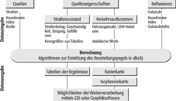 Lärmkarten, E noise maps, spezielle Umweltkarten, in denen Art und Umfang der Lärmbelastung des Siedlungsraums oder von Teilen davon (meist von Städten) in kartographischer Form anschaulich wiedergegeben werden. Den Inhalt von Lärmkarten bilden neben den meist vereinfachten topographischen Grundlagen (Basiskarte) zum einen Lärmquellen (Emittenten) und Lärmemissionen und zum anderen Lärmimmissionen. Themen dieser zumeist als analytische Karten gestalteten Emissions- und Immissions-Karten sind nach Art der Herkunft des Geräuschs (des Lärms) Verkehrslärm (untergliedert in Straßenverkehrslärm, Schienenverkehrslärm und Fluglärm), Industrie- und Gewerbelärm sowie Freizeitlärm. Komplexe Lärmkarten enthalten zusätzlich verschiedene sachliche Bezugselemente bzw. -objekte, um Korrelationen zu verdeutlichen. Solche Bezugselemente können sein: empfindliche und schutzbedürftige Bereiche (Wohnbebauung, Parkanlagen), ruhebedürftige Objekte des Gemeinbedarfs (Krankenhäuser, Schulen), aber auch vorhandene oder geplante Lärmschutzmaßnahmen passiver und aktiver Art. Auch die Bevölkerungsdichte von Wohnvierteln ist mitunter kontextmäßiger Darstellungsgegenstand. Vor der Kartenbearbeitung und Kartenherstellung erfolgt die Datenerfassung. Die Geräusche werden teils gemessen, teils berechnet. Die Visualisierung der Daten erfolgt durch Positionssignaturen, Linearsignaturen und Isolinien (Isophonen). Die Lärmemissionen oder -immissionen werden meistens entsprechend ihrer Stärke in 8 bis 15 Schallpegelbereiche (Straßenverkehr) bzw. 4 bis 6 Pegelbereiche (Schienenverkehr) oder 2 bis 4 Lärmzonen (Fluglärm) abgebildet. Bei punkthaften Emittenten (z. B. Industrielärm) wird ähnlich verfahren. Die Abbildung zeigt in vereinfachter Form die rechnergestützte Herstellung einer Karte des Straßenverkehrslärms.