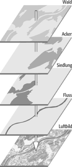 Layer:Layer: Beispiel für die Strukturierung von Geodaten durch Layer.