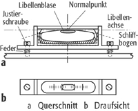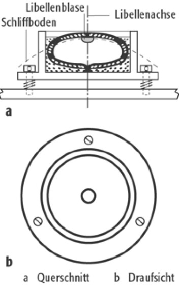 Man unterscheidet Dosenlibellen(Abb. 1) mit zylindrischem Glaskörper, dessen Deckfläche an der Innenseite kugelförmig geschliffen ist und Röhrenlibellen(Abb. 2), die aus einer zylindrischen, innen tonnenförmig geschliffenen Glasröhre bestehen. Die Libellenangabe beträgt bei Dosenlibellen 2′ bis 20′, während die Libellenangabe der Röhrenlibellen vermessungstechnischer Instrumente zwischen 10″ und 20″ liegt; Röhrenlibellen tragen eine 2-mm-Teilung.