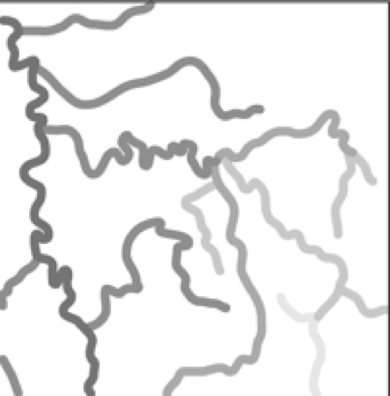Die Repräsentation der Daten in der Linienbandkarte erfolgt auf der Grundlage des kartographischen Zeichenmodells durch linienförmige Zeichen, die mithilfe der graphischen Variablen Korn und Helligkeit variiert werden können.