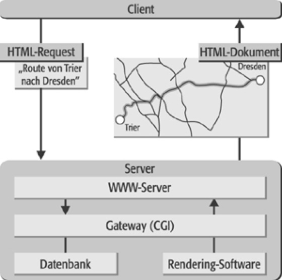 maps-on-the-fly, dynamic mapping, maps-on-demand, Erzeugung von Karten im Moment des Bedarfs nach nutzerdefinierten Einstellungen innerhalb vorgegebener Visualisierungsvorschriften. Zur Zeit aufgrund ungelöster kartographischer Grundprobleme, wie z. B. der automatisierten kartographische Generalisierung, nur in Form von vorgefertigten abrufbaren Karten bzw. in Kombination von vorgefertigten Kartenelementen und nutzerdefinierbaren Visualisierungsvorschriften möglich. Im Internet bzw. in der Telekartographie innerhalb der Client/Server-Struktur Aufgabe von map servern, die i. d. R. mittels Gateways mit WWW-Servern verbunden werden (Abb.).