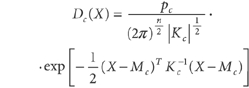 Dabei ist Dc(X)=Trennfunktion der Klasse i, c = Klasse, X=gemessener Vektor des zu klassifizierende Bildelements, Mc=Mittelwertvektor der Klasse c, pc=Wahrscheinlichkeit mit der das zu klassifizierenden Bildelement zur Klasse c gehört (setzt a priori-Kenntnisse voraus), Kc= Kovarianzmatrix der Bildelemente der Klasse c, |Kc|=Determinante von Kc, Kc-1=Inverse von Kc, T=Transpositionsfunktion.