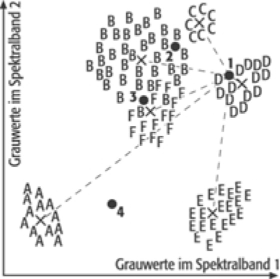 Bei der Klassifizierung muss lediglich der rechte Teil der Trennfunktion, der auch als Mahalanobis-Abstand bezeichnet wird, für jedes Bildelement neu berechnet werden. Bei gleichen a priori-Wahrscheinlichkeiten wird ein Pixel der Klasse mit dem geringsten Mahalanobis-Abstand zugeordnet (Abb.).